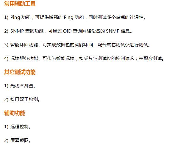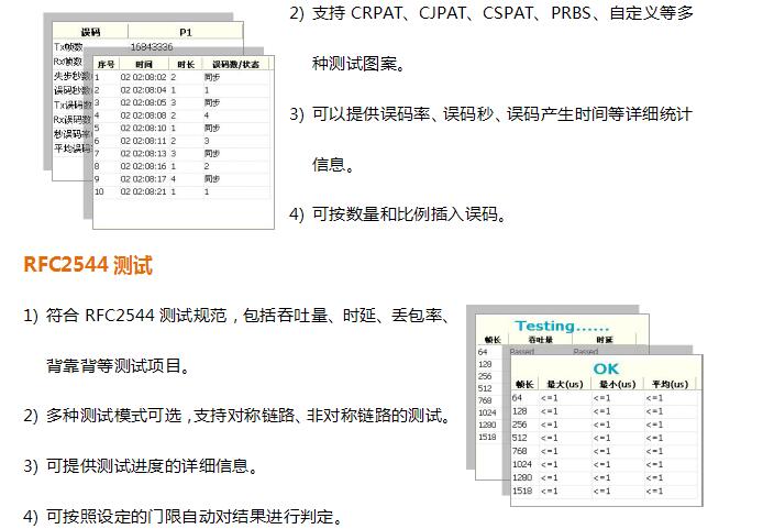 GT- 3300提供了多种性能测试工具,例如流量测试、BERT 测试、 RFC2544 测试、环回测 试等等。通过这些功能,可快速了解以太网链路的带宽、丢包、时延等性能指标,为业务的 开通和排障节省了时间。